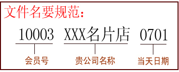 >> 1、文件命名规则:1XXXX(会员号)——公司名称——0618(日期例如6月18日) >> 2、所有名片放在同一个文件内,旁边要各注明几盒是否复膜,写好贵公司的详细联系方式 |